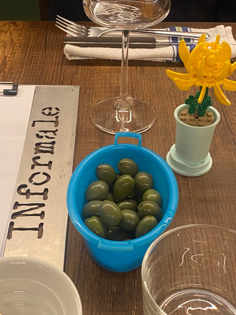 Dettagli fighissimi. Le olive sono il benvenuto e arrivano in una deliziosa bagnarola blu.