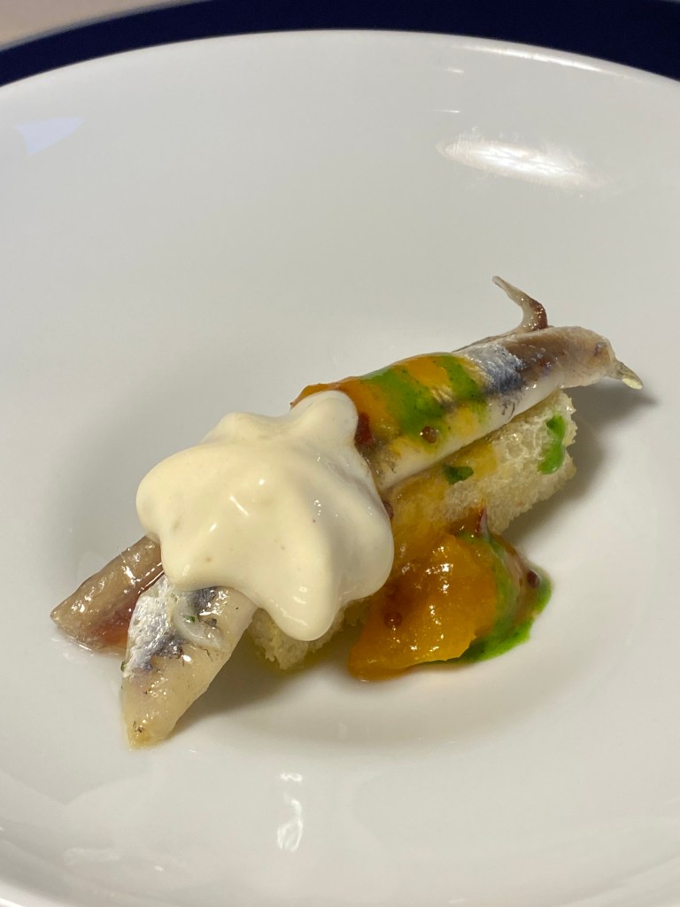 Amuse-bouche che spiana il percorso. Pane tostato, alici marinate, tocco agrodolce, spuma di mandorle e chutney di albicocche. Contrasti d’autore.