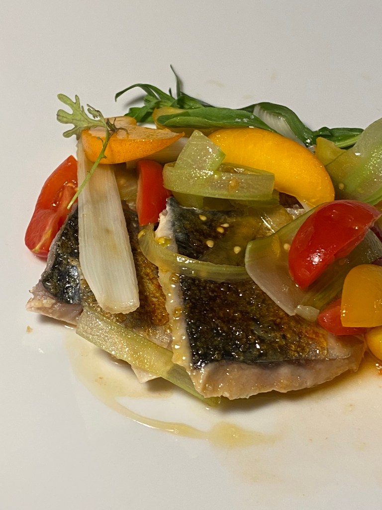 Lo Sgombro cbt col crunchy caramellato in superficie inonda di umami salmastro giocoso. Tendenza dolce costante nel party fresco e colorato di datterini gialli e rossi, cipollotto nocerino, albicocca e riduzione di aceto di mele. Una finestra sul mare.