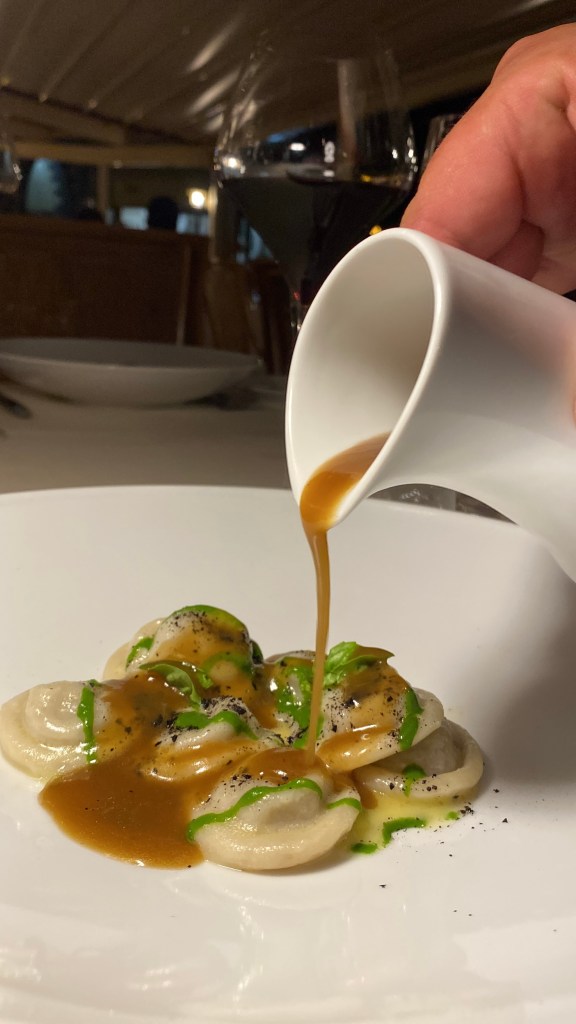 I Bottoni alla Genovese coronano l’impronta stilistica e il temperamento emotivo. Materia, tecnica, vanità. Il brodo di cipolla di Montoro rincara la dose aromatica con succulenza necessaria e affettiva. Divini.