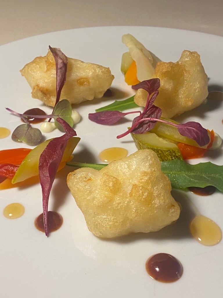 Il Baccalà in pastella, 24 kt, scherza con la sfacciataggine della salsa barbecue in un prato di verdure estive. Dipinto.