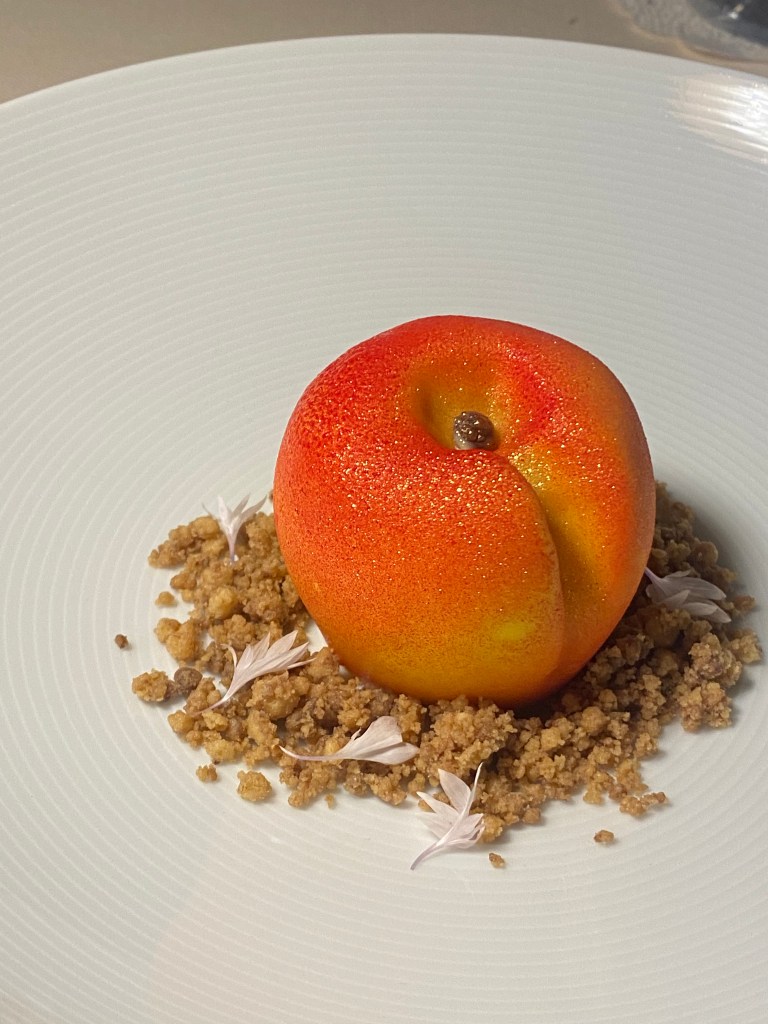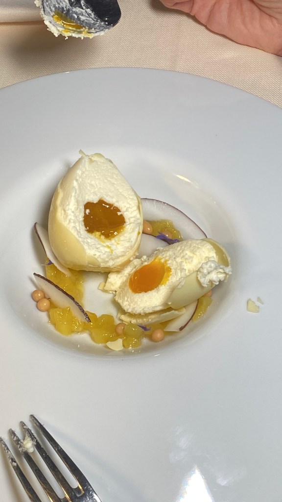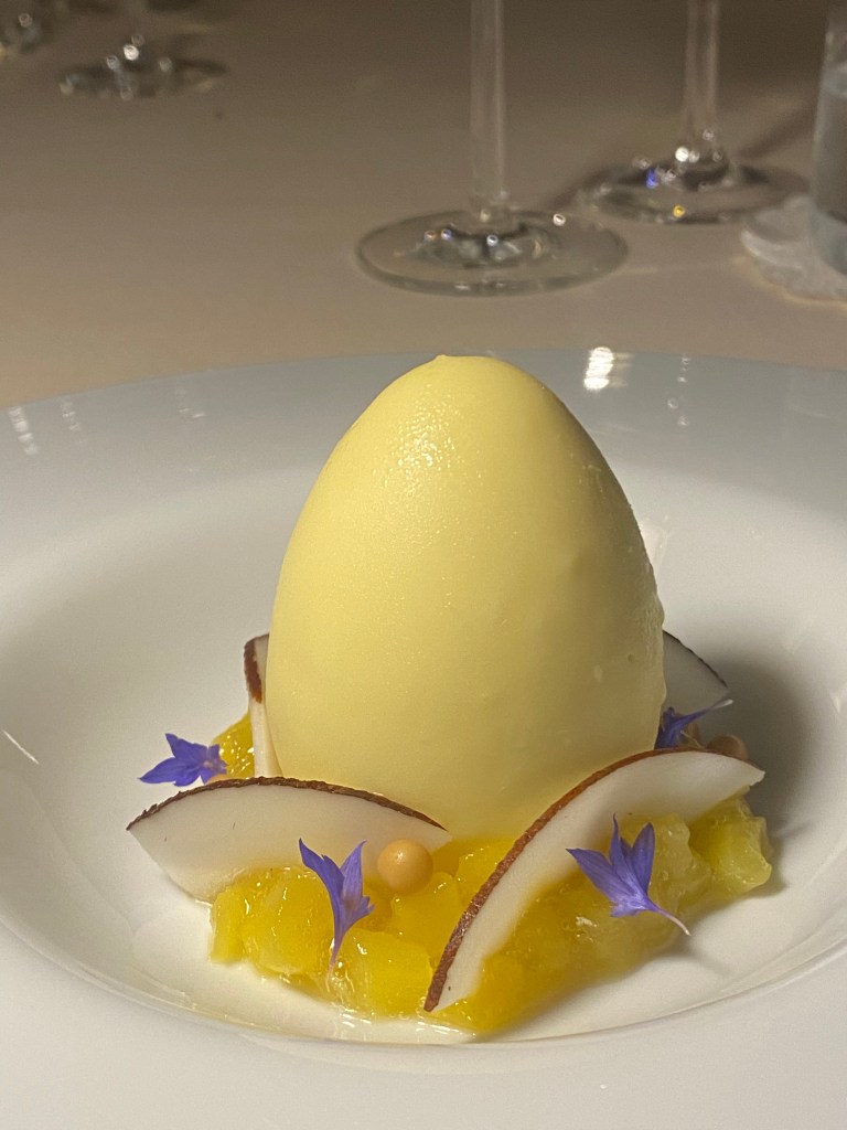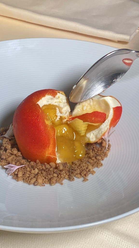 Stessa linfa e vigore cromatico si ritrovano nei dessert iridescenti di Mario Bossa: O’ Vin ca’ Percoca, ganache montata alla vaniglia, cuore morbido al vino e pesca gialla, crumble al finocchietto selvatico; Uovo di Cocco, bavarese al cocco, crema di mango e maracuja servita su una brunoise di ananas. Affascinanti, decisi, 3D.