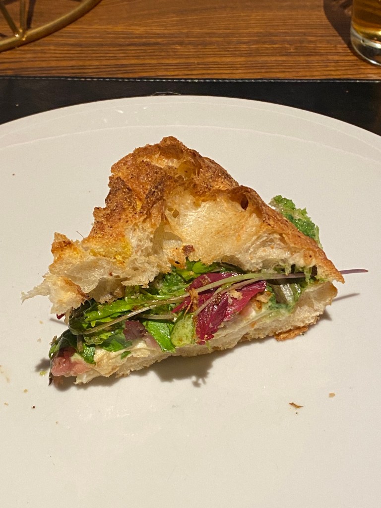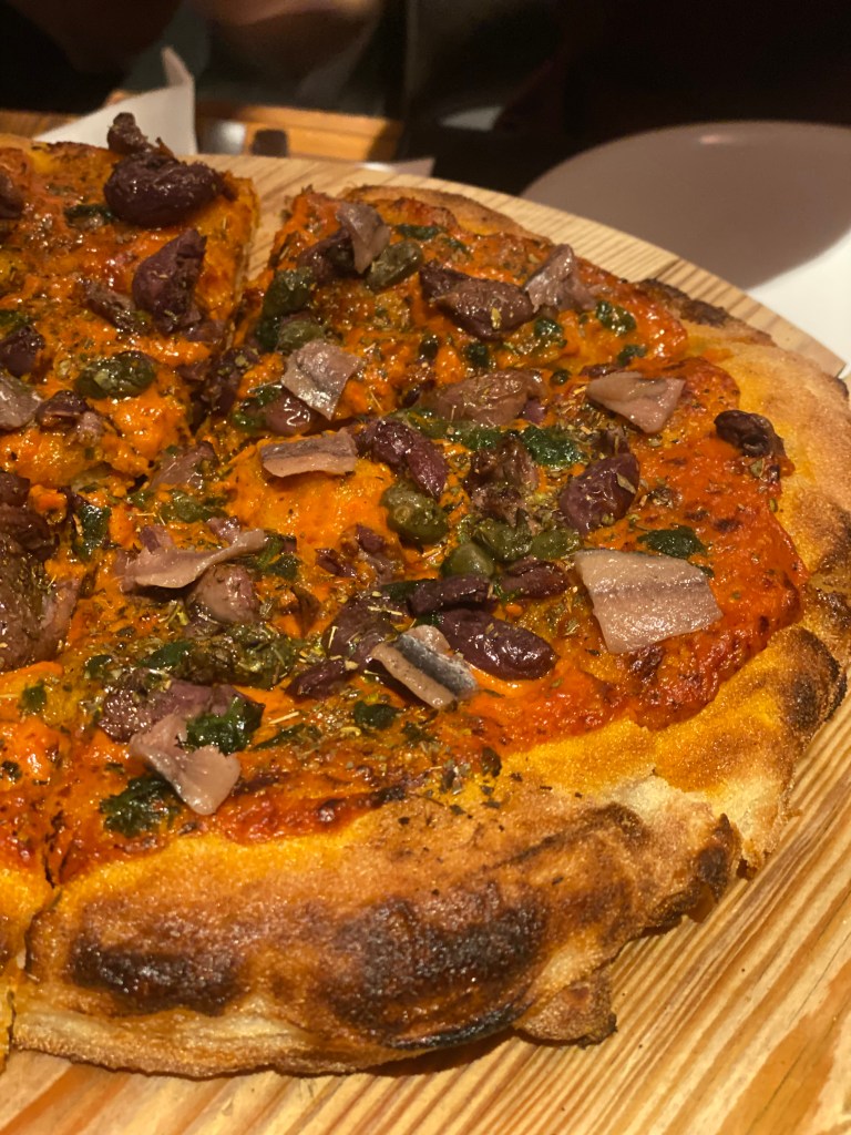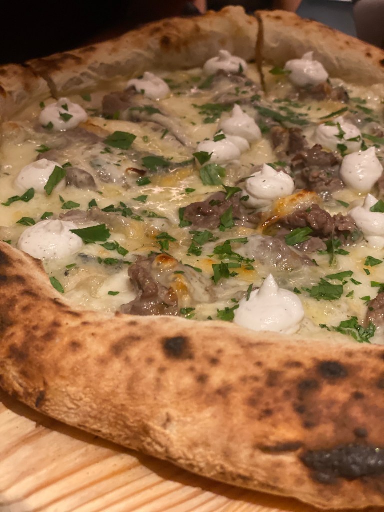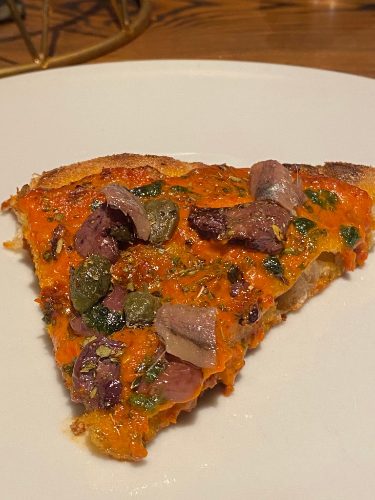 Stesso impasto ma design salmastro. Tuna Green. Amaro costante di broccolo barese. Mordente che amplifica l’umami iodato della ventresca di tonno, acidità e piccantezza di yogurt alla ‘nduja. Mirabilmente armonizzata e ragionata. Stellata.