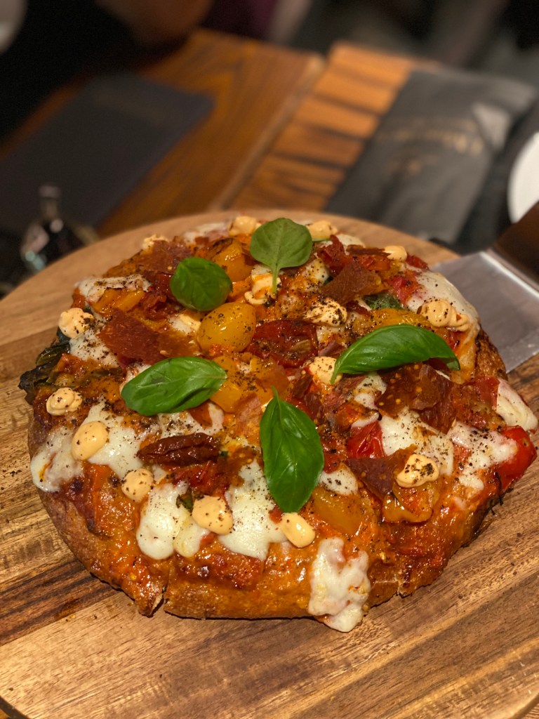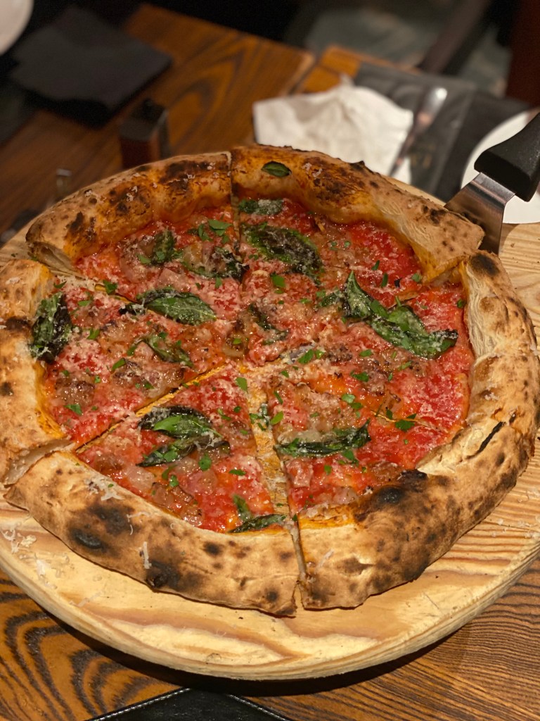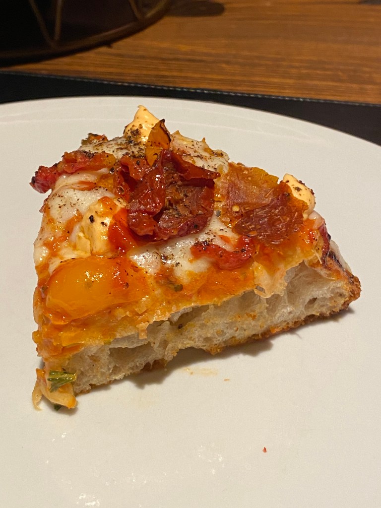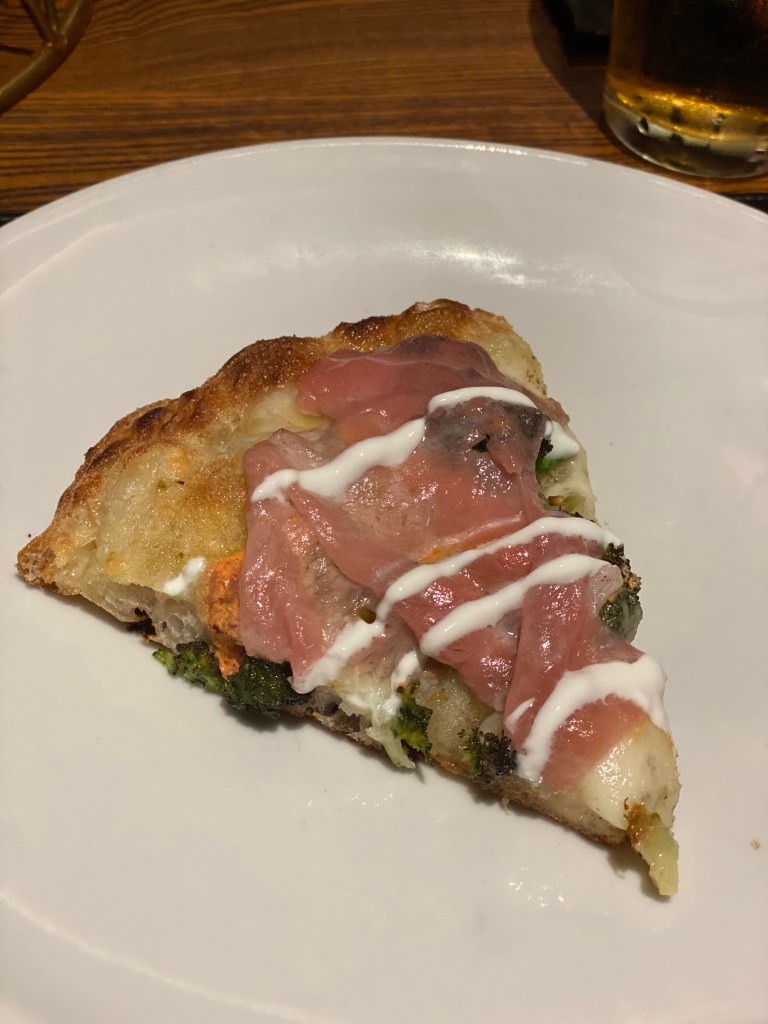 Stesso impasto ma design salmastro. Tuna Green. Amaro costante di broccolo barese. Mordente che amplifica l’umami iodato della ventresca di tonno, acidità e piccantezza di yogurt alla ‘nduja. Mirabilmente armonizzata e ragionata. Stellata.