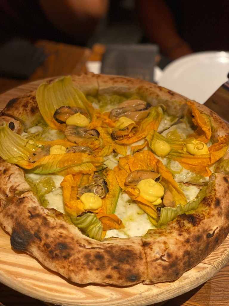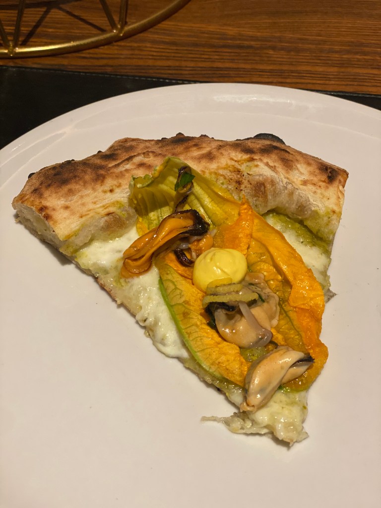 La terra si schianta con l’energia iodata del mare. Fiori di zucca al quadrato modello 25 con i frutti di mare. Cozze affumicate e marinate diventano umami perlato tra cremosità di zucchine e pistilli, fiori crudi tendenza dolce e vegetale, amarognolo ad allungare di maio allo zafferano, freschezza di zest. Alleria.