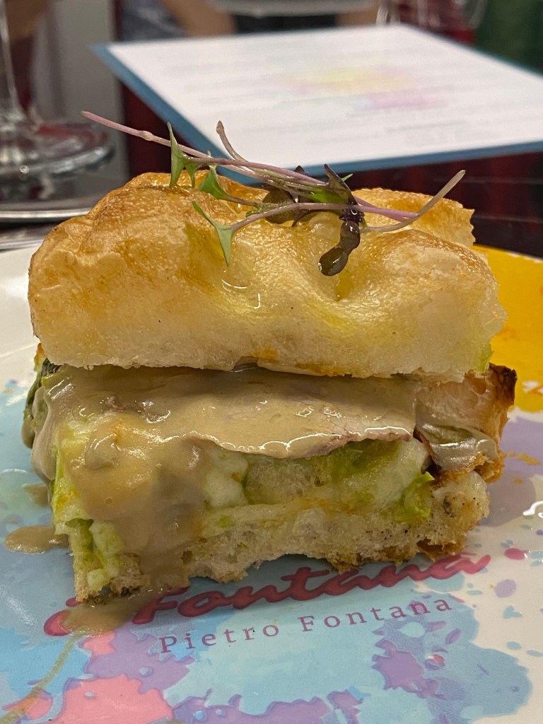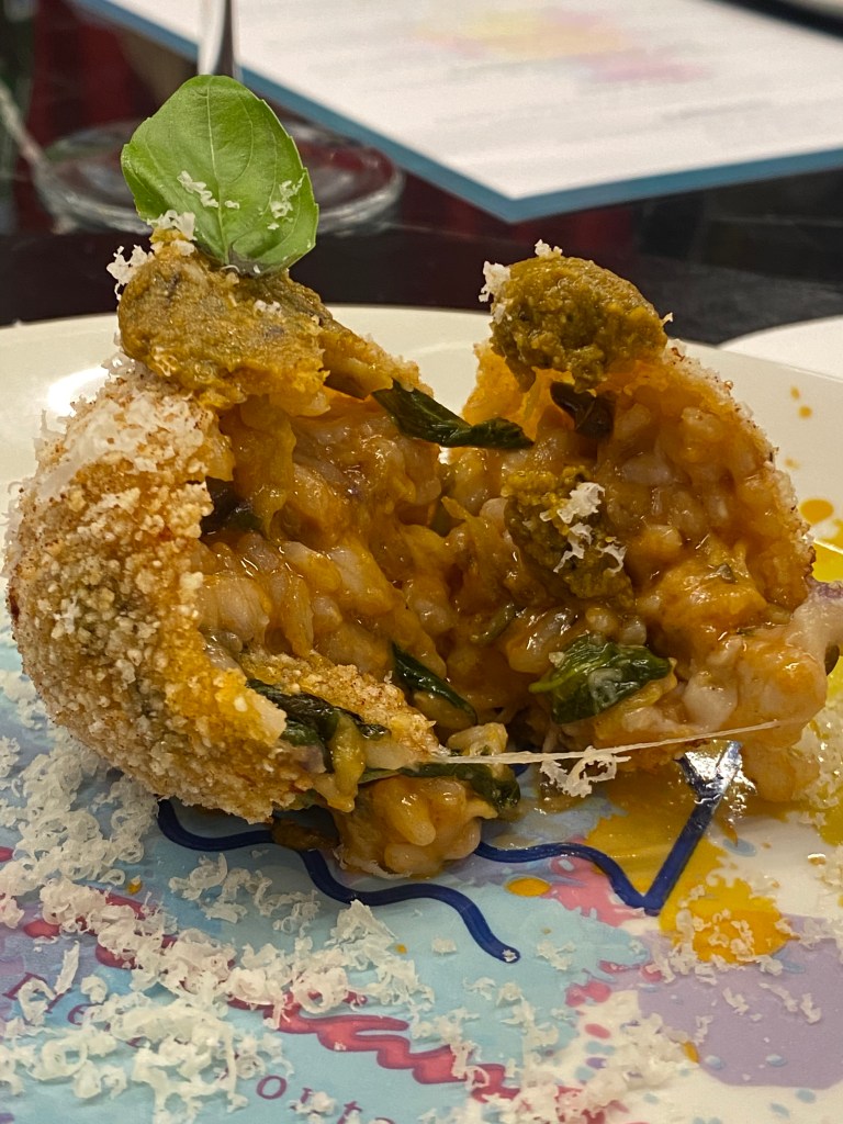 L’Arancino alla Parmigiana grida spessore. Concentrato di melanzane, crosta che scrocchia, vivacità di carnaroli. Beneducato.