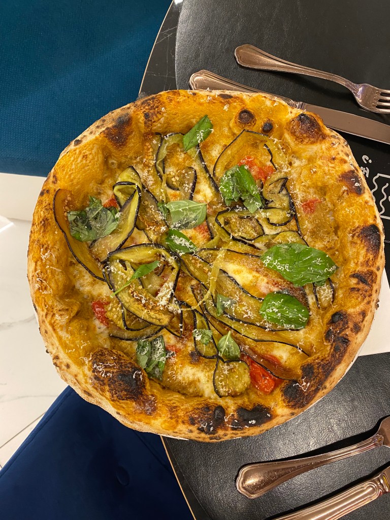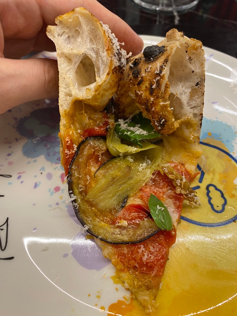 La Pamigiana alla brace conserva tutta l’essenza della stagionalità fumé. Piaciona, la comfort zone aiuta. Cremosità alla base, l’impronta aromatica costante. Foulard di melanzane fritte fanno da scintille croccanti. L’impasto ormai l’ancoraggio imprescindibile. Linfa familiare.