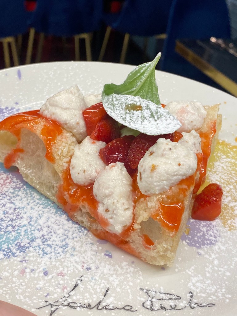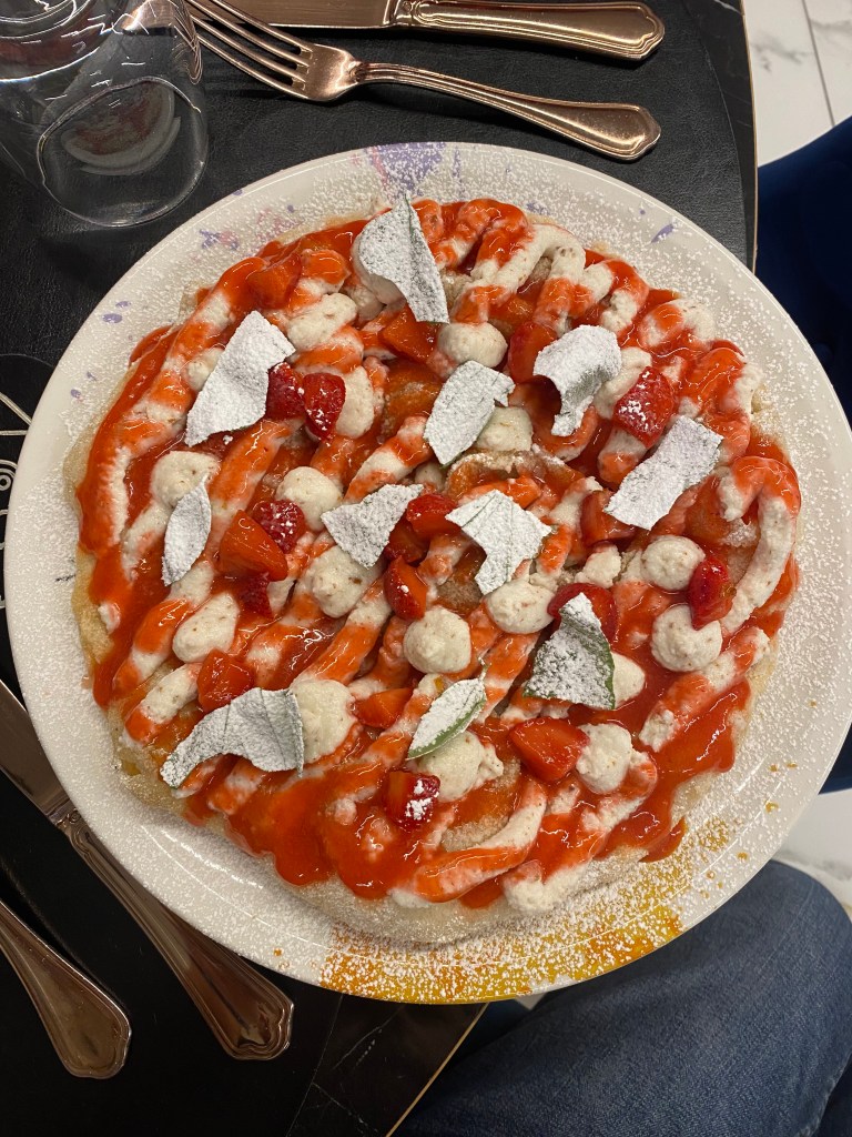 La Provola e pepe a ruota di carro fa da pre-dessert. Innesto di Margherita a definire il percorso. Impasto fritto, asciugato al forno e caramellato. Un coro di fragole tra spalti di ricotta di bufala e armelline. Sinuosa.